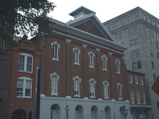 On the evening of April 14, 1865, President and Mrs. Lincoln decided to go to a play being presented at Ford's Theater, just a few blocks from the White House. (You can see the theater in the first picture.) At the theater they were given the choicest box seats and were relaxing in their chairs watching the play when John Wilkes Booth, an actor sympathetic to the cause of the Confederate states, entered the box and shot Lincoln. Booth then jumped up onto the railing of the box and dropped a considerable distance to the stage, breaking his ankle in the fall. In spite of his injury he limped behind the curtains and out a back door to a waiting horse which carried him away. He was later apprehended. Lincoln was carried out of the theater and across the street to the house you see in the second picture. It is known as the Petersen House today because it was built by a man named William Petersen in 1849. Doctors attended the president as he lay in a bedroom on the main floor. He never regained consciousness, and he died early the next morning. |
